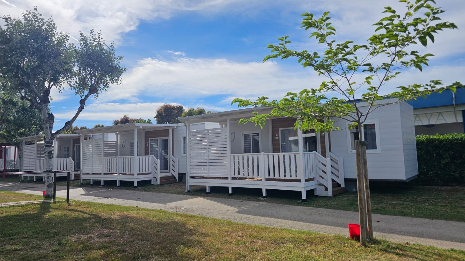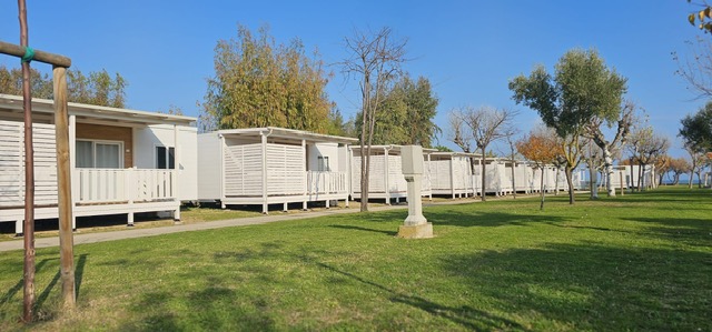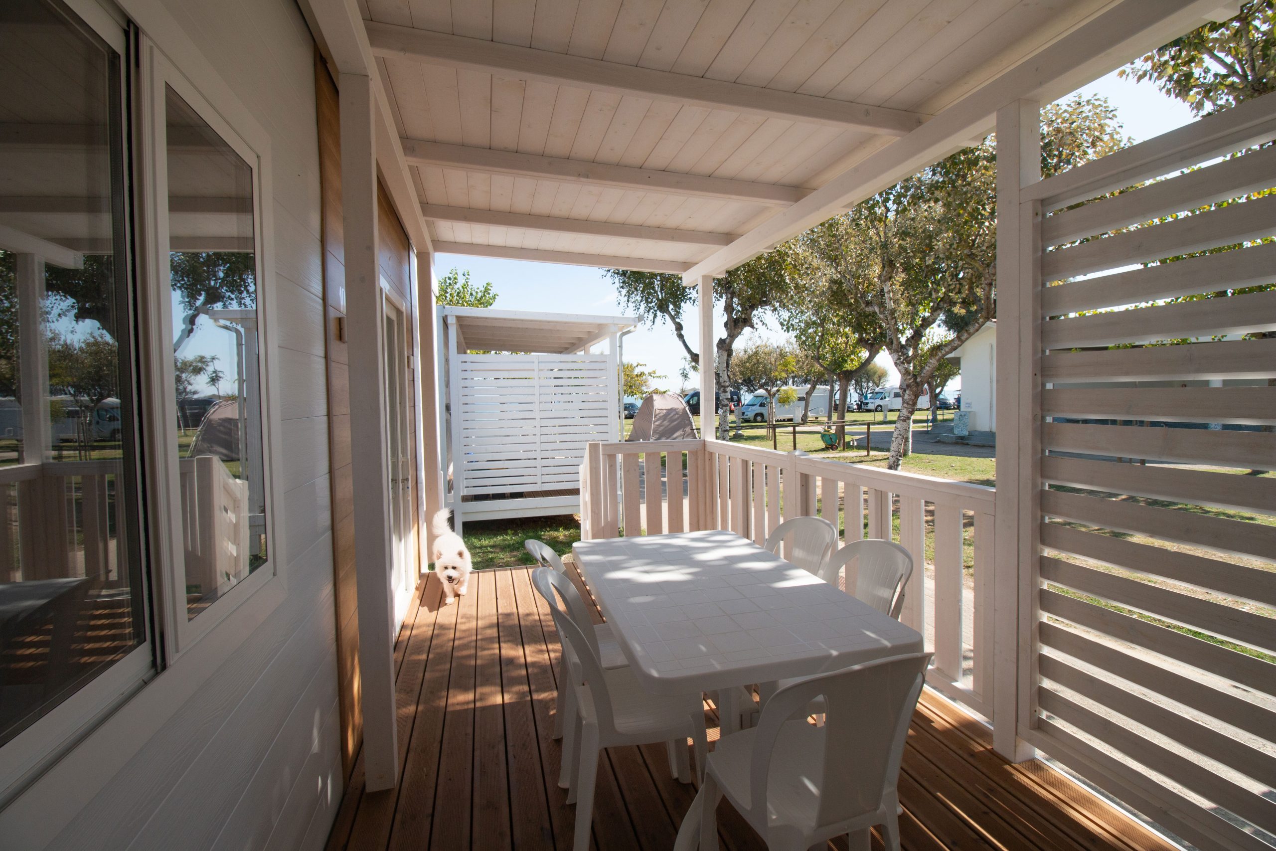 Veranda in legno coperta (ca.12 mq.) e rialzata rispetto al piano strada (3 gradini), attrezzata con tavolo, sedie e set raccolta differenziata.