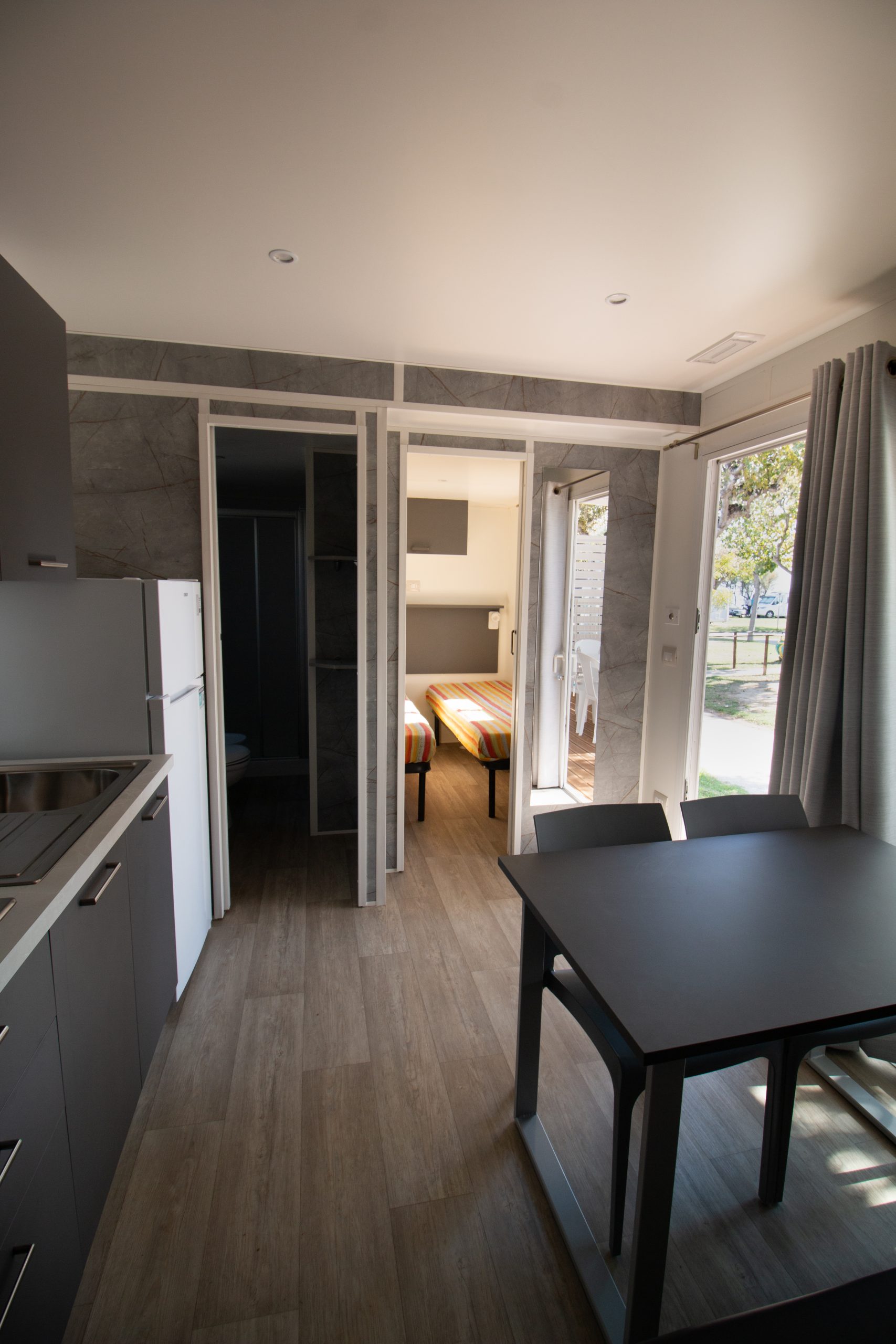 Soggiorno con angolo cottura e piano a quattro fuochi, frigorifero 230lt con freezer separato, tavolo sedie.